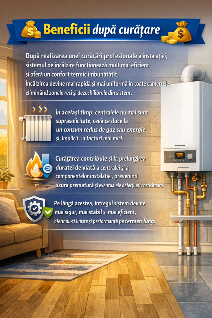 După realizarea unei curățări profesionale a instalației, sistemul de încălzire funcționează mult mai eficient și oferă un confort termic îmbunătățit. Încălzirea devine mai rapidă și mai uniformă în toate camerele, eliminând zonele reci și dezechilibrele din sistem.