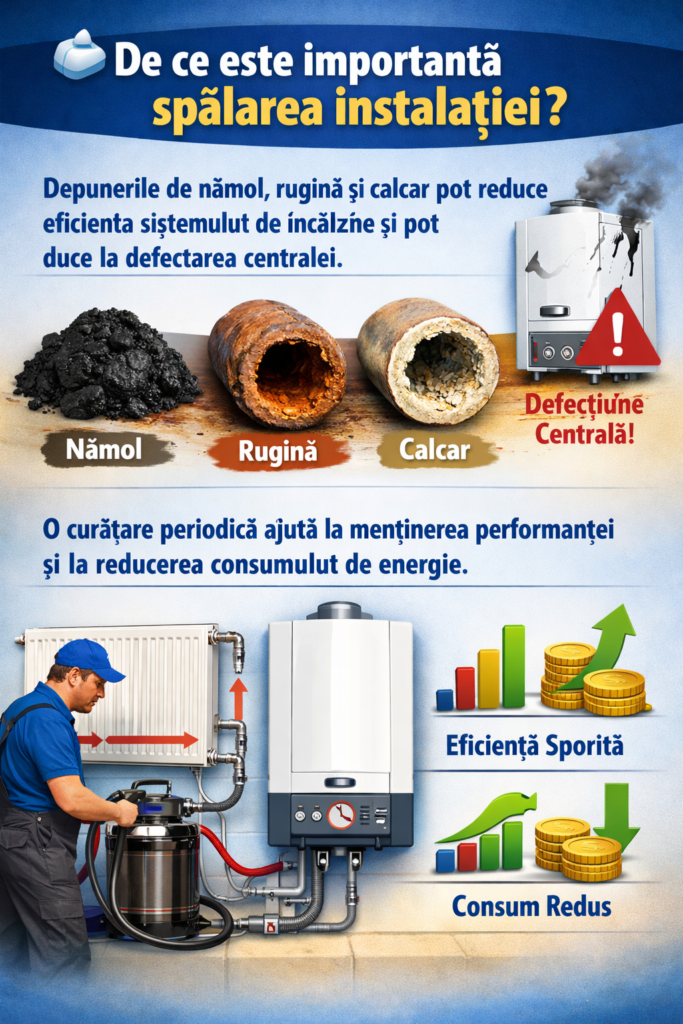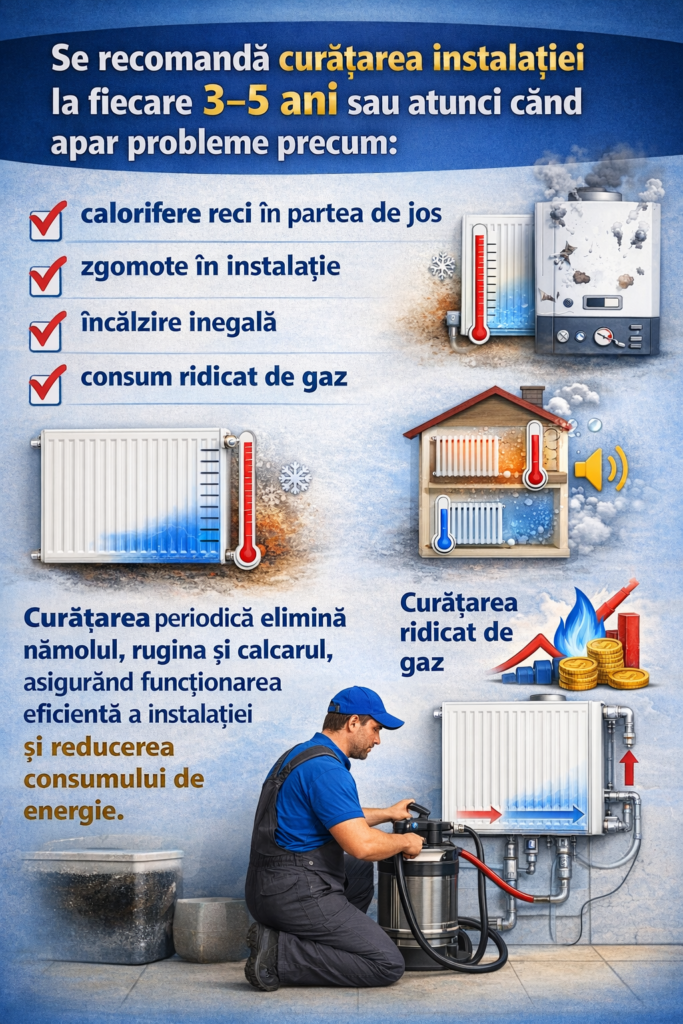 Se recomandă curățarea instalației la fiecare 3–5 ani sau ori de câte ori apar semne că sistemul nu mai funcționează eficient. În timp, în interiorul instalației se acumulează nămol, rugină și alte depuneri care afectează circulația apei și transferul de căldură.