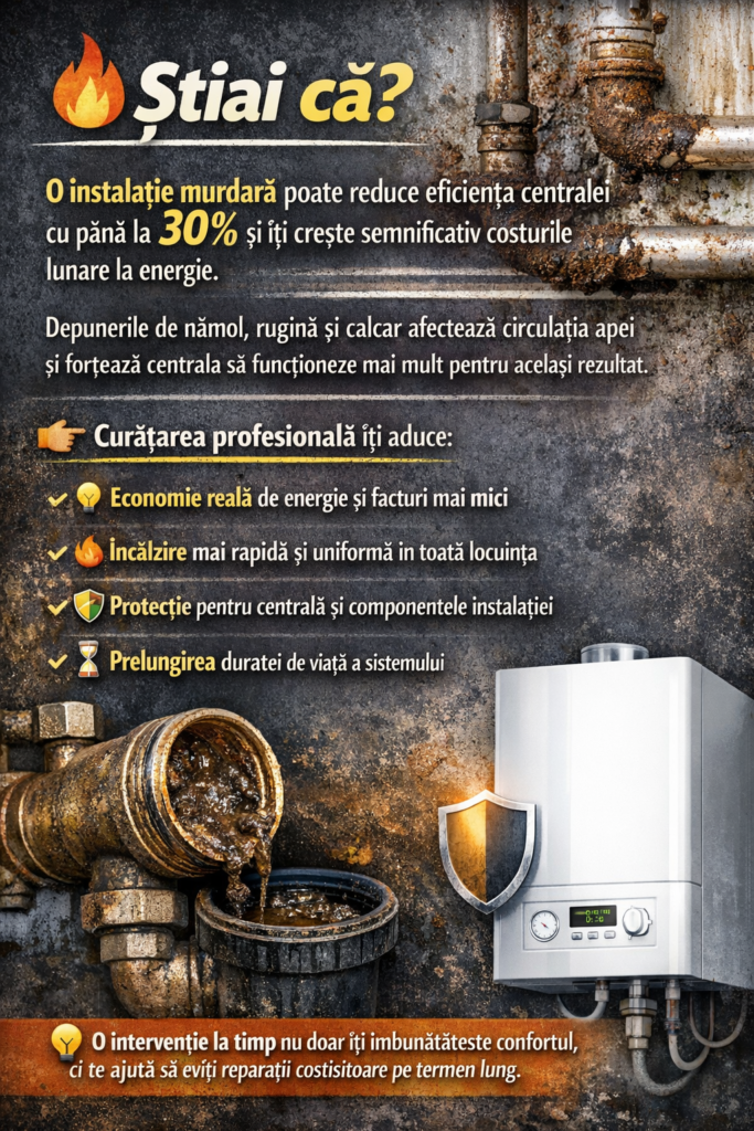 Aceste probleme nu doar reduc confortul termic, ci pot duce în timp la uzura prematură a centralei și la costuri mai ridicate de întreținere. O curățare profesională a instalației ajută la eliminarea depunerilor, stabilizarea presiunii și restabilirea funcționării optime a întregului sistem.