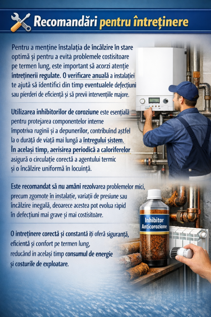 Pentru a menține instalația de încălzire în stare optimă și pentru a evita problemele costisitoare pe termen lung, este important să acorzi atenție întreținerii regulate. O verificare anuală a instalației te ajută să identifici din timp eventualele defecțiuni sau pierderi de eficiență și să previi intervențiile majore. Utilizarea inhibitorilor de coroziune este esențială pentru protejarea componentelor interne împotriva ruginii și a depunerilor, contribuind astfel la o durată de viață mai lungă a întregului sistem. În același timp, aerisirea periodică a caloriferelor asigură o circulație corectă a agentului termic și o încălzire uniformă în locuință. Este recomandat să nu amâni rezolvarea problemelor mici, precum zgomote în instalație, variații de presiune sau încălzire inegală, deoarece acestea pot evolua rapid în defecțiuni mai grave și mai costisitoare. O întreținere corectă și constantă îți oferă siguranță, eficiență și confort pe termen lung, reducând în același timp consumul de energie și costurile de exploatare.