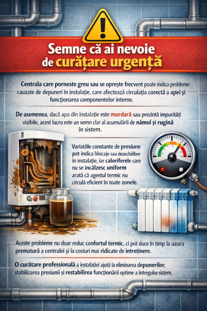 Printre cele mai frecvente probleme care indică necesitatea unei curățări se numără caloriferele reci în partea de jos, zgomotele neobișnuite în instalație, încălzirea inegală a locuinței sau un consum ridicat de gaz.